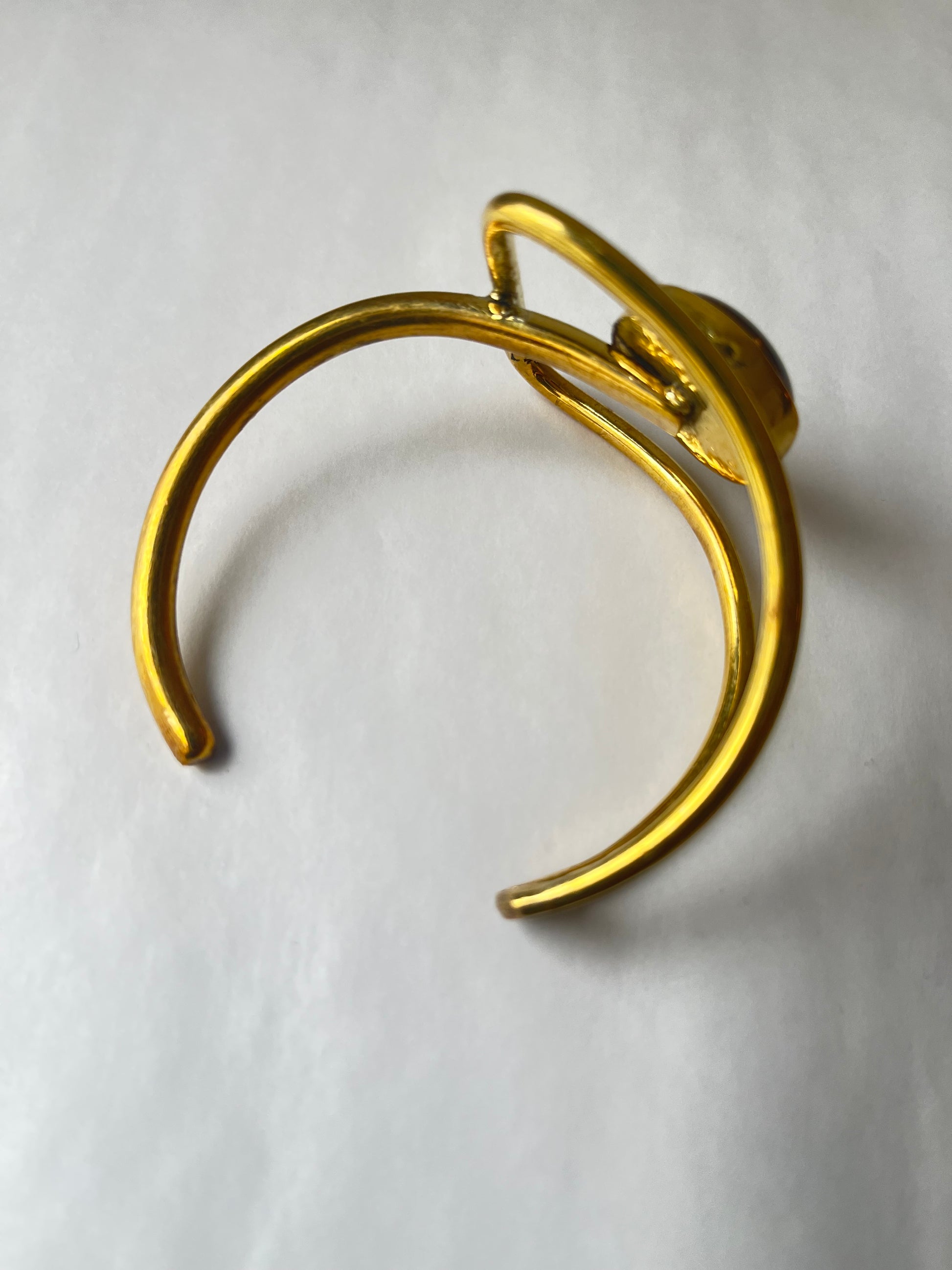 A sculptural brass bracelet featuring a luminous amber-toned stone at its center. Handcrafted with fluid curves and an open adjustable design, this statement cuff blends modern elegance with artisanal craftsmanship.